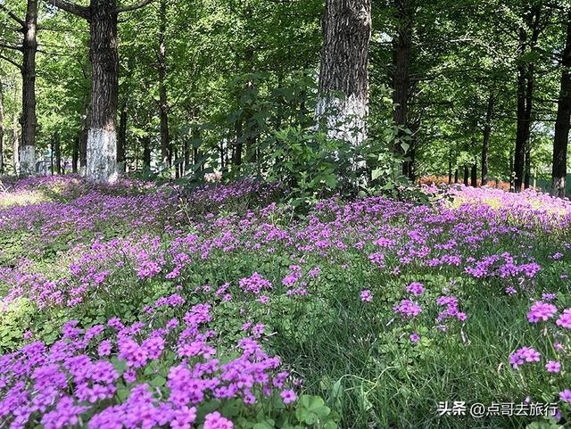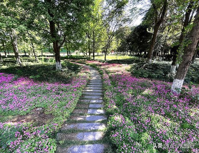 沿着石板小径深入,路径两侧的花簇如紫霞织就的锦带。阳光穿过杏叶的缝隙,在花上投下斑驳的光影,有的花瓣亮得通透,有的则浸在柔和的阴影里,明暗交错间,酢浆草的紫愈发深邃动人。偶有新叶的嫩绿探入视野,与紫花相映,将春天的生机展现得淋漓尽致。来到深处,林间的静谧更浓。高大的杏树如绿伞撑开,树干底部的白漆在绿意中格外醒目。脚下的泥土混着落叶的气息,身旁是酢浆草柔软的花毯,每一步都像踩在春日的诗里。抬头是嫩绿的银杏叶,低头是酢浆草花毯,仿佛整个春天都藏进了这紫色的梦幻之中。