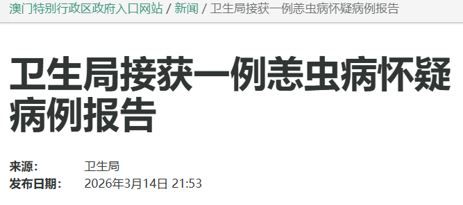 据澳门特别行政区政府入口网站3月14日消息,卫生局接获一例恙虫病(又称丛林斑疹伤寒)疑似病例报告,这是澳门今年首例恙虫病疑似病例,为输入性病例。