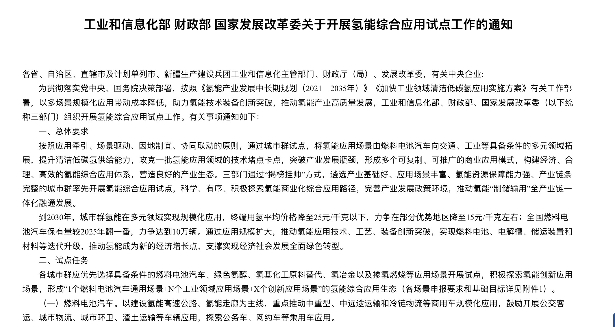 按照《通知》目标,到2030年,城市群氢能在多元领域实现规模化应用,终端用氢平均价格降至20元/千克以下,力争在部分优势地区降至15元/千克左右;全国燃料电池汽车保有量较2025年翻一番,力争达到10万辆。