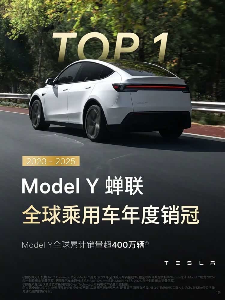 在2023—2025连续三年蝉联全球乘用车销冠,累计销量突破400万辆,便是Model Y的勋章。甚至可以说,它是电动化时代最具标志性的车型。