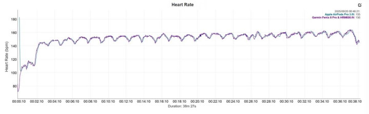 Nick Harris-Fry 以 Garmin HRM600 胸带(电信号级精度)作为对照,结果发现 AirPods Pro 3 的心率曲线几乎与胸带重合,尤其在稳态跑与间歇跑这种对精度要求极高的场景下,两条曲线如同镜像般贴合。